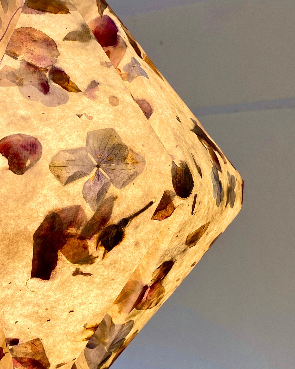 The Roses and Hydrangeas lampshade is a limited series of pendant lamps created from handmade paper composed of hemp fibre, mulberry bast, and freshly gathered flowers. The roses and hydrangeas are directly embedded into the material, defining the unique pattern of each piece.